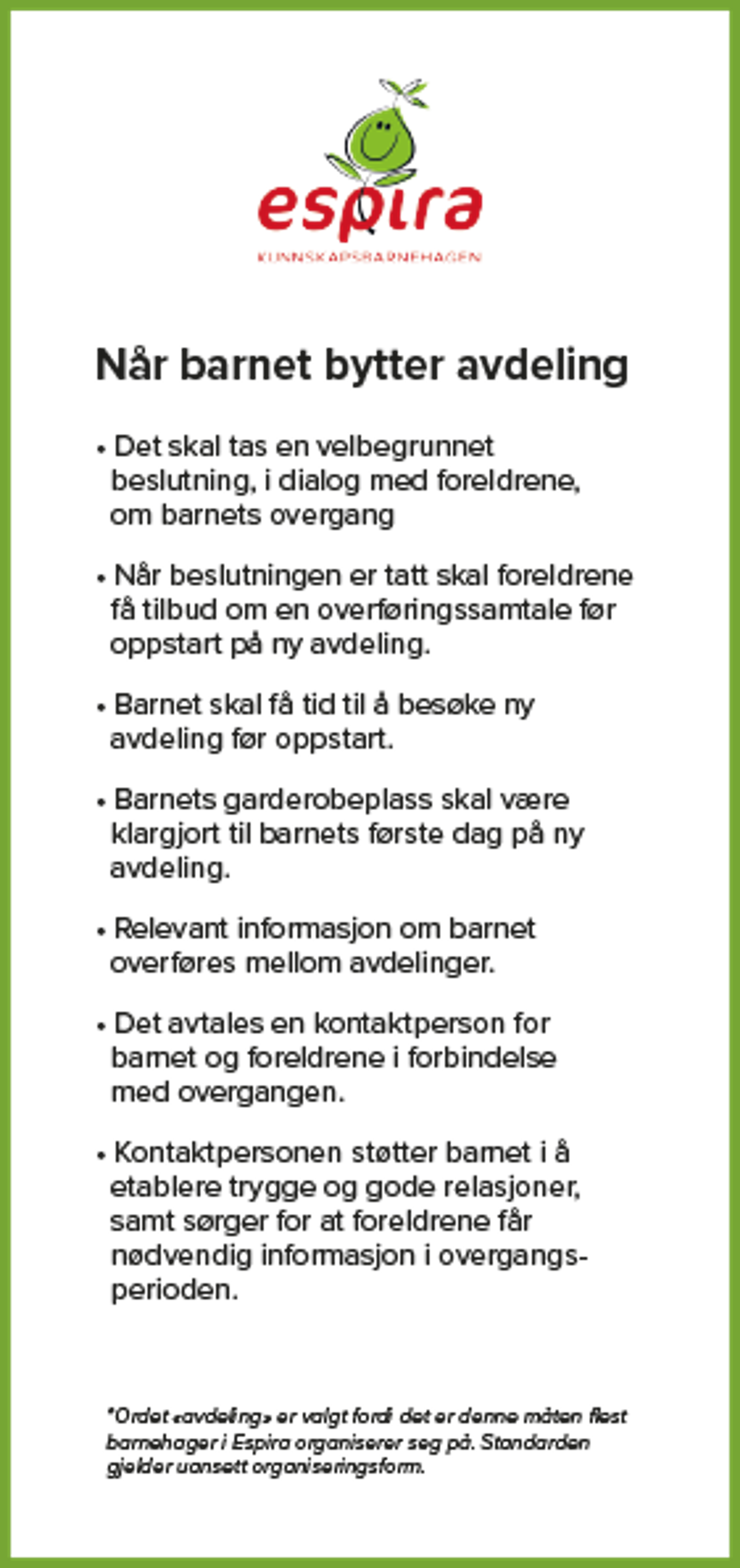 En god overgang for barnet ditt er også avhengig av et godt samarbeid mellom barnehagen og deg som er forelder. I Espira har vi en standard for når barnet skal bytte avdeling. Standarden skal sikre at alle våre barnehager støtter både barn og foreldre i en trygg overgang når barnet bytter avdeling.